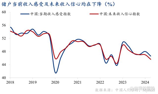 居民消費(fèi)疲乏,且表現(xiàn)為追求性價(jià)比,導(dǎo)致企業(yè)生產(chǎn)供給偏多,競(jìng)爭(zhēng)激烈下價(jià)格注定承壓。企業(yè)利潤(rùn)變薄,居民工資收入有下行壓力,而且企業(yè)繼續(xù)投資的意愿和能力均下降,工資收入預(yù)期也轉(zhuǎn)弱。央行調(diào)查顯示,今年二季度儲(chǔ)戶對(duì)當(dāng)前收入感受及收入信心均在下滑。