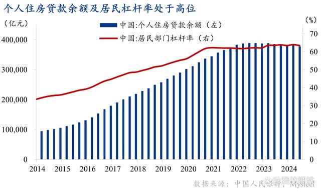 房產(chǎn)在居民資產(chǎn)中占比較高,約占家庭總資產(chǎn)的三分之二,房?jī)r(jià)下行必然導(dǎo)致居民資產(chǎn)縮水,然而房貸償還壓力依然較大。截至2024年二季度,居民個(gè)人住房貸款余額仍有37.8萬億元,杠桿率徘徊在63.5%的高位。居民收入優(yōu)先償債,可支配收入減少,消費(fèi)自然下滑。