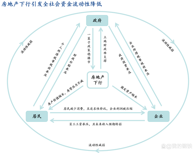 據(jù)前文所述,需求疲軟是物價(jià)低迷的表觀原因,深究則可能是消費(fèi)者的資產(chǎn)負(fù)債情況惡化以及收入預(yù)期轉(zhuǎn)差:地產(chǎn)行業(yè)進(jìn)入下行周期,房?jī)r(jià)的持續(xù)下跌一方面導(dǎo)致居民和企業(yè)的資產(chǎn)負(fù)債表惡化,縮減支出;另一方面也使財(cái)政收入承壓,疊加前期擴(kuò)表的債務(wù)清償壓力,共同導(dǎo)致社會(huì)流動(dòng)資金縮水。