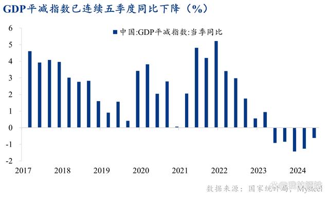 國(guó)內(nèi)生產(chǎn)總值平減指數(shù)可以反映整體經(jīng)濟(jì)價(jià)格水平,該指標(biāo)自2023年二季度起,至今年二季度已連續(xù)五個(gè)季度同比下降,市場(chǎng)擔(dān)心該指標(biāo)可能將下降延續(xù)至2025年,這將創(chuàng)下中國(guó)自1993年數(shù)據(jù)開始以來最長(zhǎng)的通縮記錄。