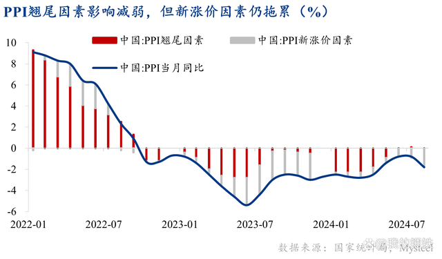 8月CPI受農(nóng)產(chǎn)品供給波動(dòng)推高,而非食品尤其耐用消費(fèi)品價(jià)格低迷,暴露出實(shí)際消費(fèi)需求的疲軟。PPI持續(xù)下滑也顯示供應(yīng)大于需求的矛盾和外需見頂?shù)膿?dān)憂。GDP平減指數(shù)自2023年二季度起已連續(xù)五個(gè)季度同比下降,市場(chǎng)開始擔(dān)憂該指標(biāo)的通縮壓力會(huì)延續(xù)至2025年。