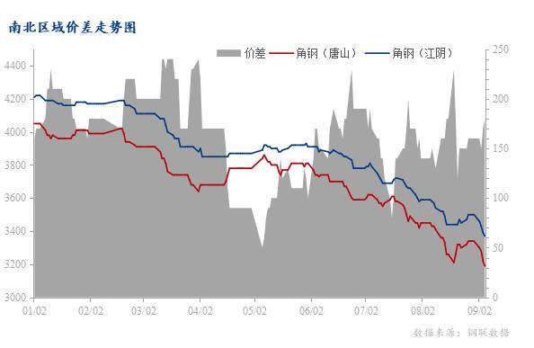 從圖1來看,目前整體型鋼價格處于回升的狀態,從8月初價格下滑進入年內低點,進入9月開始呈現反彈傾向,目前市場價格較8月底上漲100-230元/噸。目前華東主流城市角鋼均價3430元/噸,槽鋼均價3453元/噸,工字鋼均價3503元/噸。